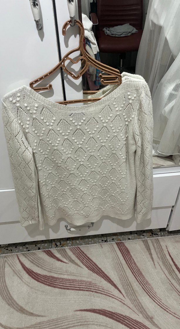 Bu beyaz örgü kazak, uzun kollu ve yuvarlak yaka tasarımı ile bol kesimdir. Rahat ve bohem tarzda, dokulu örgü deseni bulunur, günlük kullanım için uygundur.