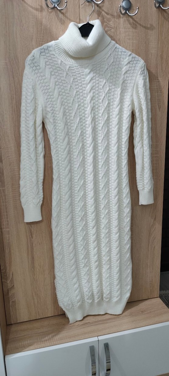 Beyaz, uzun kollu ve örgü triko kumaştan yapılmış, bohem tarzda, günlük kullanıma uygun, vücuda oturan bir elbisedir.