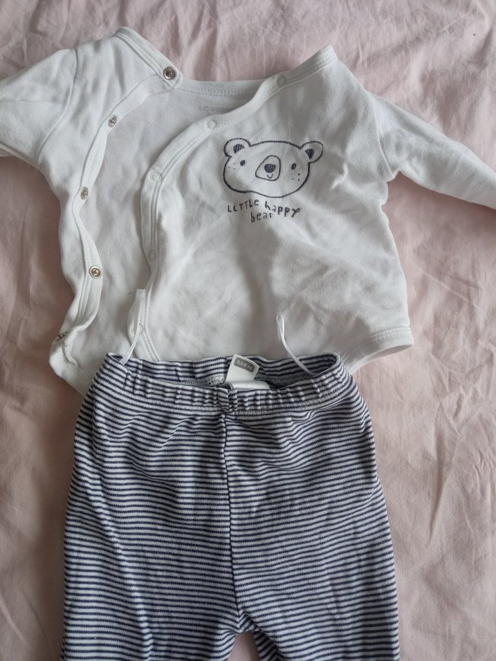 Pamuklu, uzun kollu beyaz üstü ayı baskılı, düğmeli ve gri beyaz çizgili pantolonlu bebek takımı.