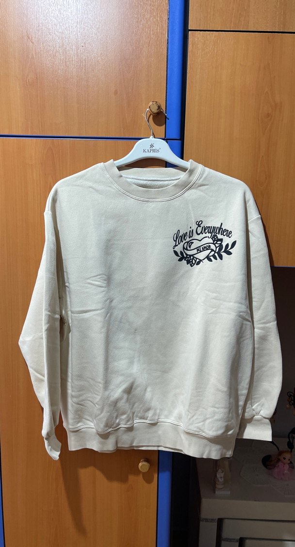 Beyaz pamuklu sweatshirt, uzun kollu ve bisiklet yaka. Göğüs kısmında baskılı desen bulunur. Rahat kesimi ve normal boyu ile günlük kullanıma uygundur. Yumuşak kumaşıyla konfor sağlar.
