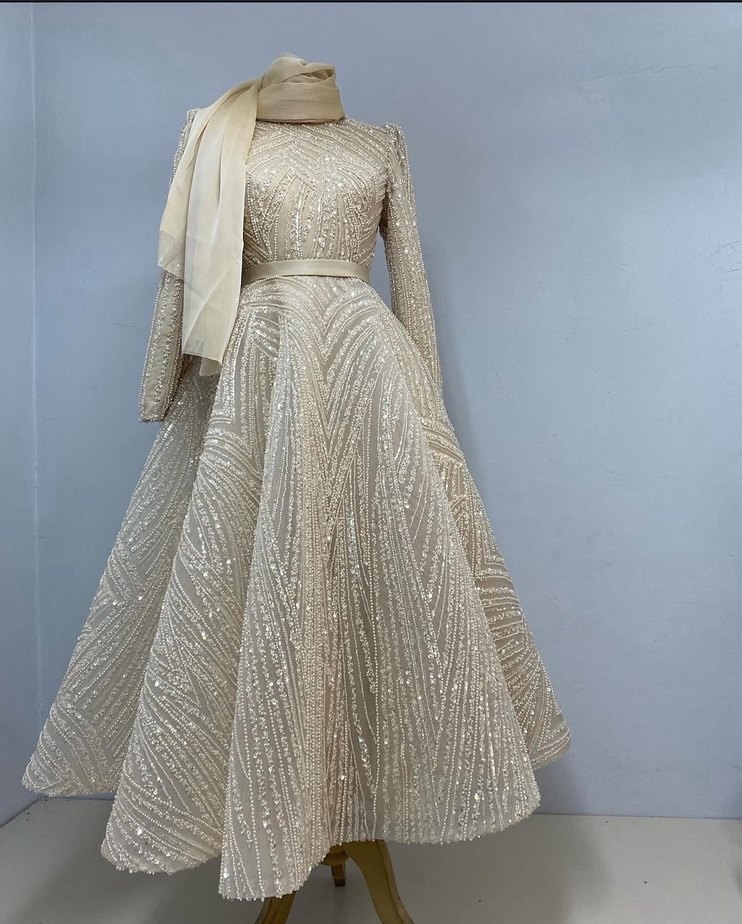 Uzun Kollu Beyaz Parlak Abiye Elbise