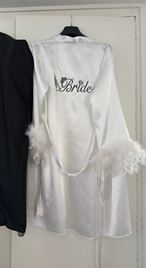 Uzun kollu ve tüy detaylı beyaz parlak sabahlık, gevşek kesim ve midi boy. Arkasında "Bride" baskısı bulunur. Small fakat M-L ye kadar olur geniş kesim