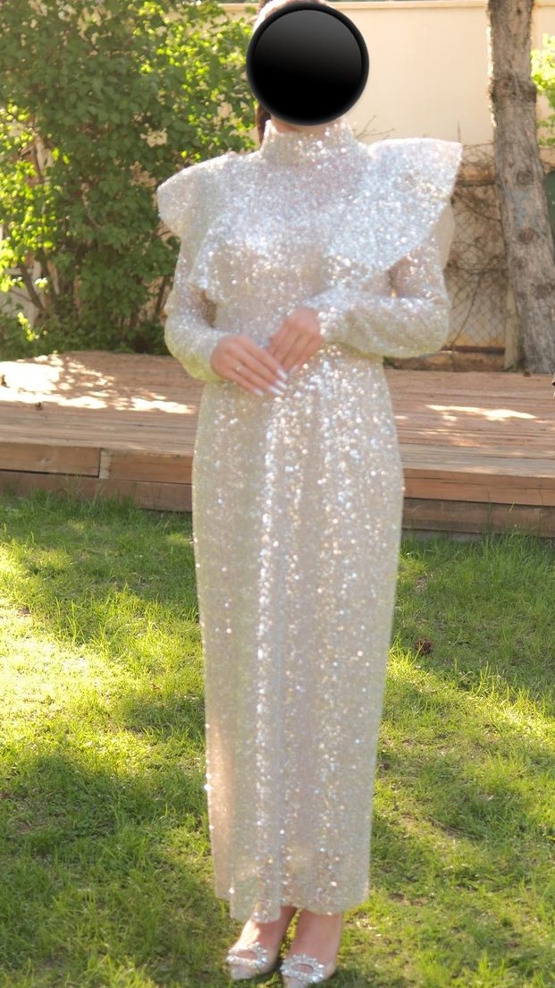 Parlak simli kumaştan, uzun kollu ve yüksek yakalı, uzun boylu ve vücuda oturan beyaz nişan elbisesi. Düğünler için uygun, sade ve şık. ✨ hiçbir defosu yoktur marka : vassago no 8