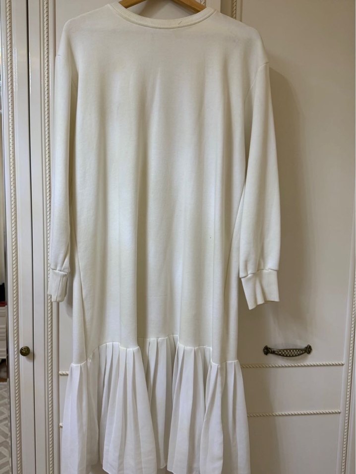 Uzun kollu, yuvarlak yakalı, keten kumaştan yapılmış beyaz elbise. Etek kısmında pilili detayıyla sade ve şık bir görünüm sunar.