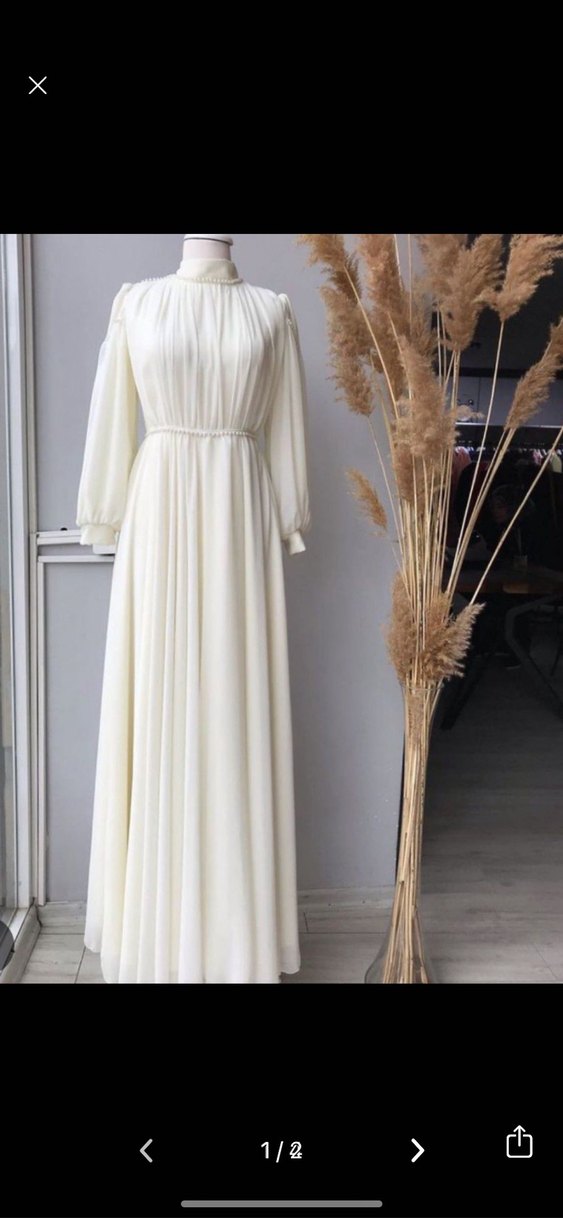 Yüksek yakalı, uzun kollu, piliseli detaylara sahip beyaz uzun elbise. Hafif keten kumaştan, bol kesimdir. Vintage esintili modern klasik tarzda, düğünler için uygundur.