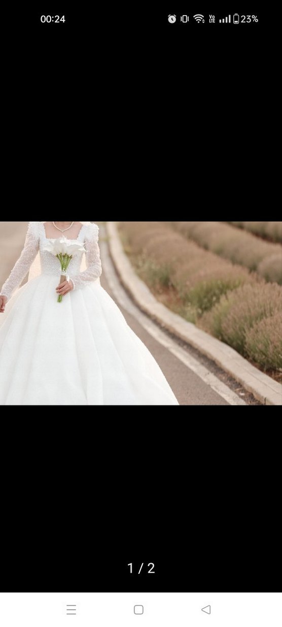 Uzun kollu ve straplez yaka, modern klasik tarzda, hafif beyaz kumaştan yapılmış oturan prenses gelinlik. fiyatın da yardımcı olurum bir kere giyildi .