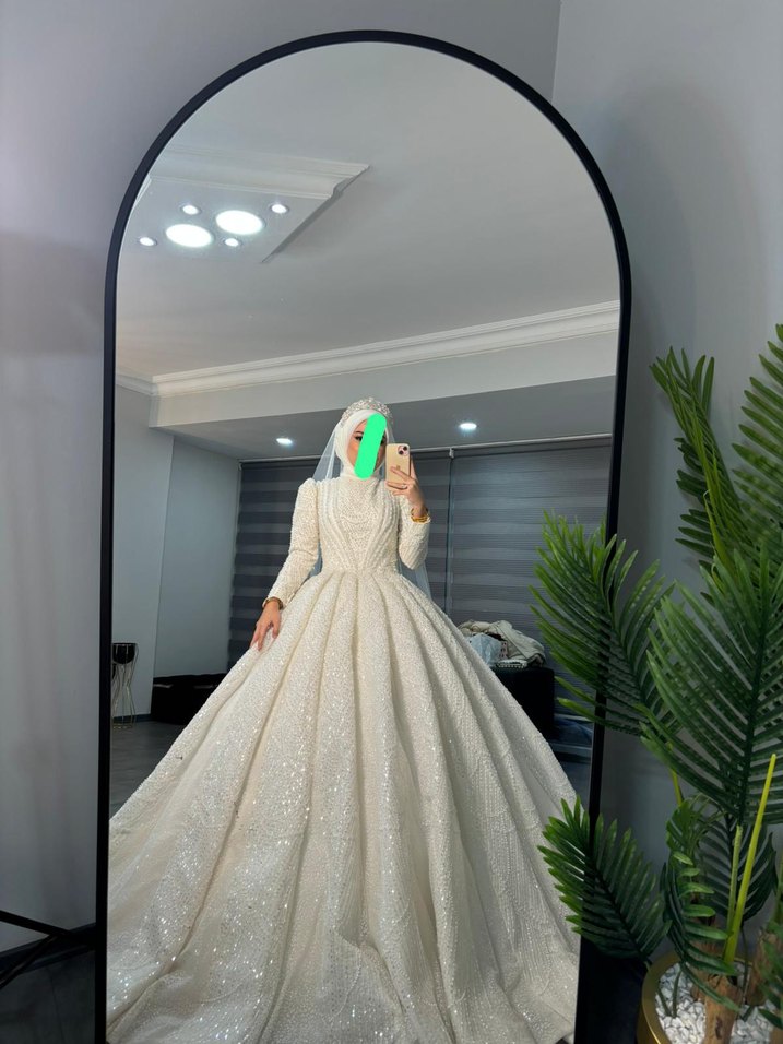 Yüksek yakalı, uzun kollu beyaz prenses gelinlik, modern klasik tarzda, modest kesim ve uzun etek boyuyla göz alıcı bir şıklık sunar.