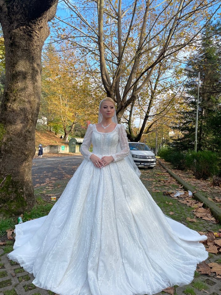 Bu uzun kollu, beyaz renkte modern klasik tarzda, vücuda oturan prenses gelinlik klasik zarafeti ve göz alıcı bir şıklığı yansıtıyor. Sadece düğünümde giydiğim ve giydiğimde 54 kiloydum.