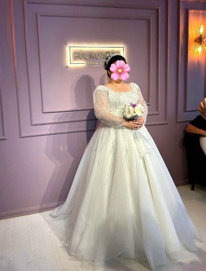 Üst kısmı boncuk ve pul işlemeli. Omuzları hafif vatkalı gibi. Arkası ipli olduğu için 46 bedenden 52 bedene kadar olabilir. Boyum 1.68 cm 10 cm topuklu ayakkabıyla giydigimde boyu fotograftaki gibi olmuştur. Arkası hafif kuyruklu. Ben giyerken tarlatanla giydim fakat satarken tarlatanla satmıyorum. Düğünüm ve kınam aynı gün olduğu için gelinlik sadece 2 saat giyildi. Duvağını da yanında göndereceğim.