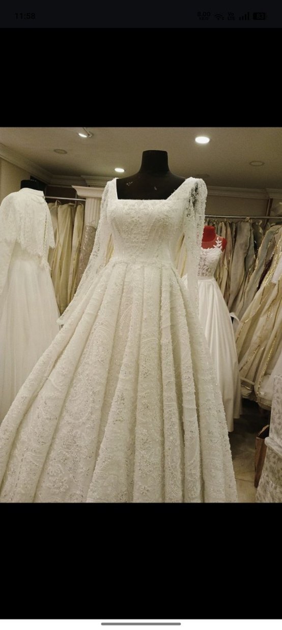 Bu beyaz prenses gelinlik, tekne yaka ve uzun kollu olup vintage dantel detayıyla tasarlanmıştır. Modern klasik stil ve uzun kesime sahiptir.