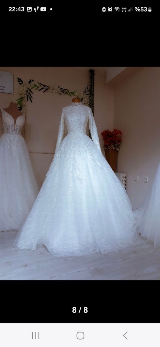 Uzun kollu, yüksek yakalı beyaz prenses gelinlik, klasik ve gösterişli tarzıyla düğünler için şık ve vücuda oturan bir siluet sunar.