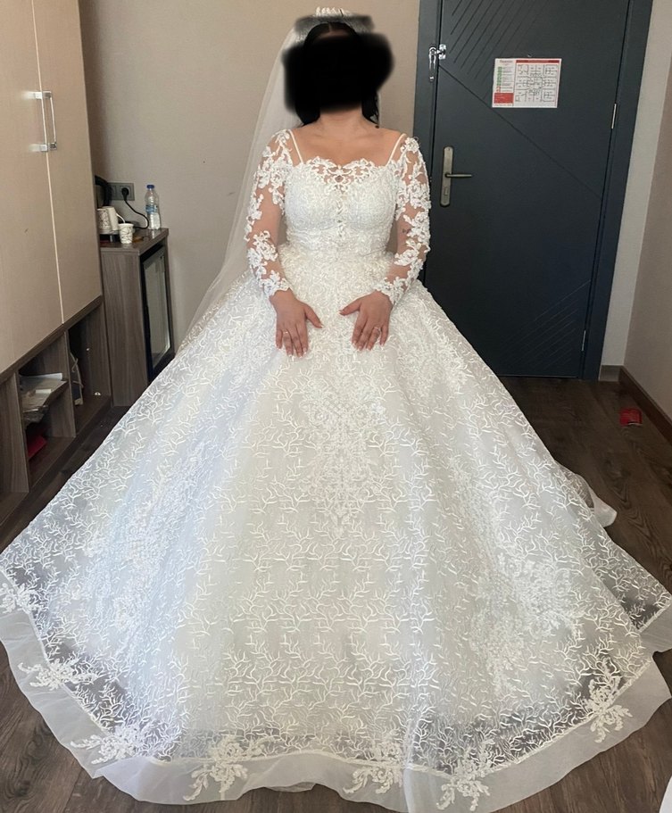 Uzun kollu, straplez yaka ve dar kesim ile modern klasik görünüme sahip beyaz prenses gelinlik. Zarif dantel detaylarıyla klasik düğünler için uygundur.