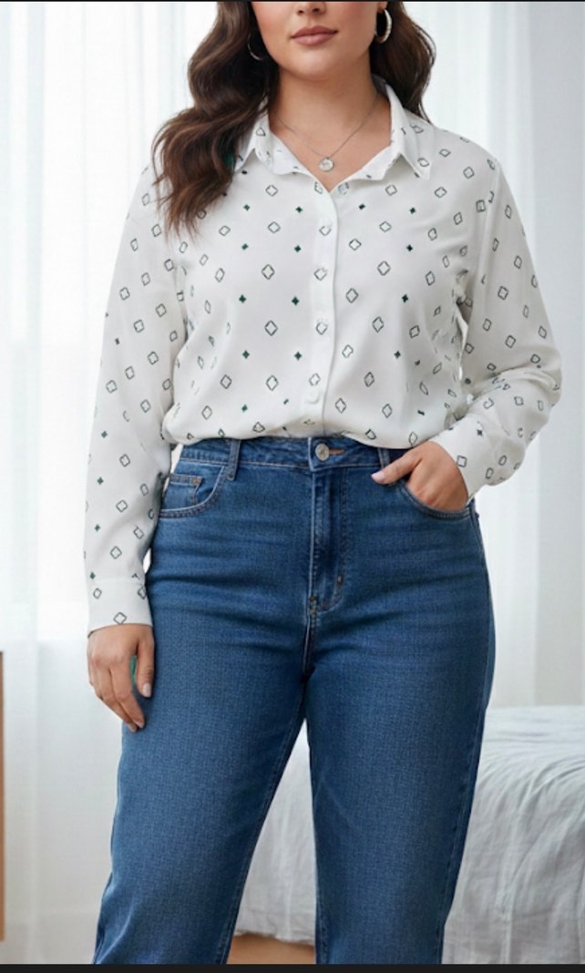 Uzun kollu, düğmeli ve V yaka beyaz kadın gömleği. Hafif denim kumaştan, puantiyeli desenli, normal kesim ve midi boyda, günlük rahat kullanım için uygun.