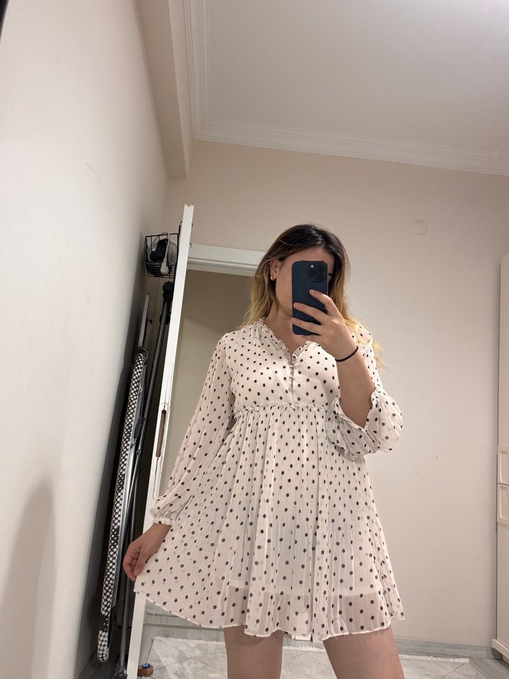 Beyaz puantiyeli midi elbise, uzun kollu ve V yakalıdır. Hafif pamuklu kumaştan, bol kesim ve transparan dokuludur, günlük kullanıma uygundur.