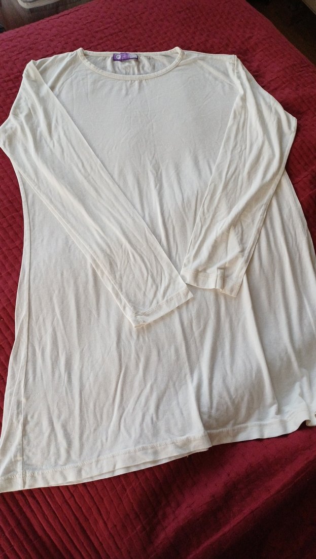 Uzun kollu, yuvarlak yakalı beyaz hamile tişörtü, rahat kesimi ve yumuşak keten kumaşıyla günlük kullanım için uygundur. Minimalist ve sade tasarıma sahiptir. beden 44