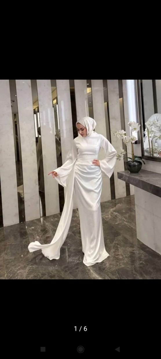 Yüksek yakalı, uzun kollu beyaz elbise, saten dokusuyla drapeli ve modest bir tasarıma sahiptir. Düğünler için uygundur.