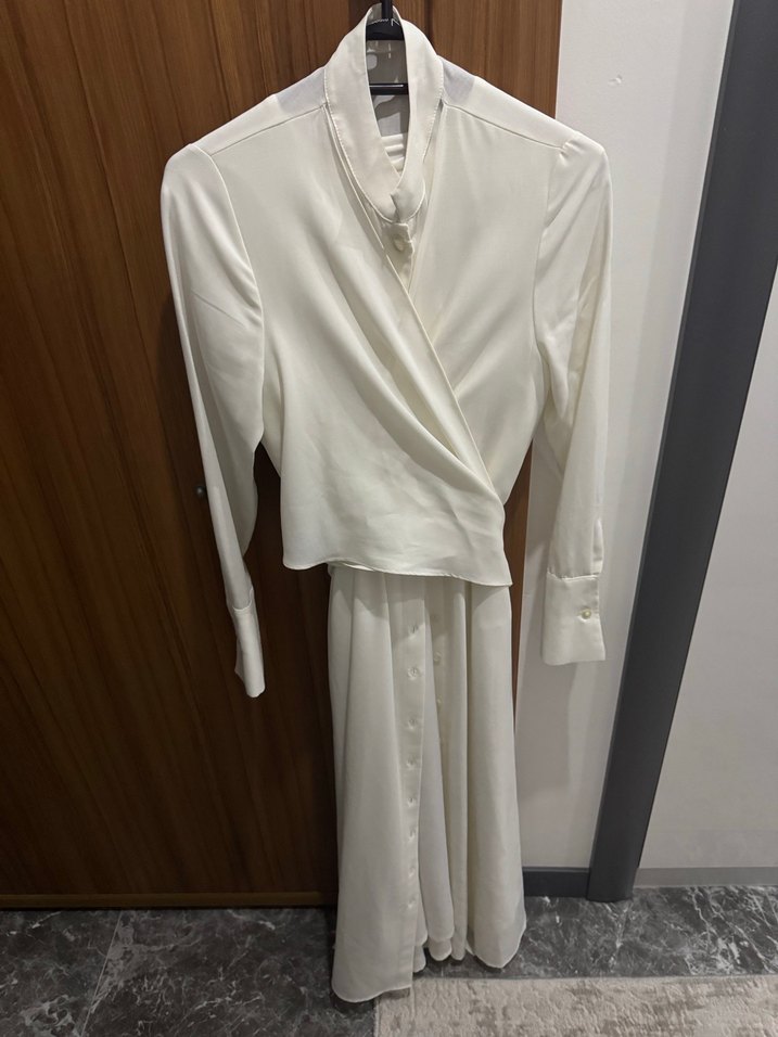 Yüksek yakalı, uzun kollu beyaz saten elbise, drapeli tasarımıyla ve rahat kesimiyle ofis stiline Paris sokak modası dokunuşu katıyor.