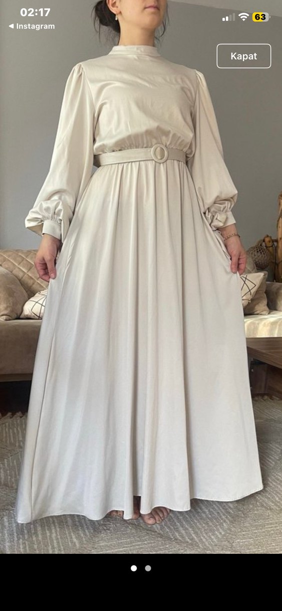 Yüksek yakalı, uzun kollu beyaz saten kumaştan, dökümlü ve bol kesim uzun elbisedir. Modern klasik tarzı düğün ve vintage etkinliklere uygundur.