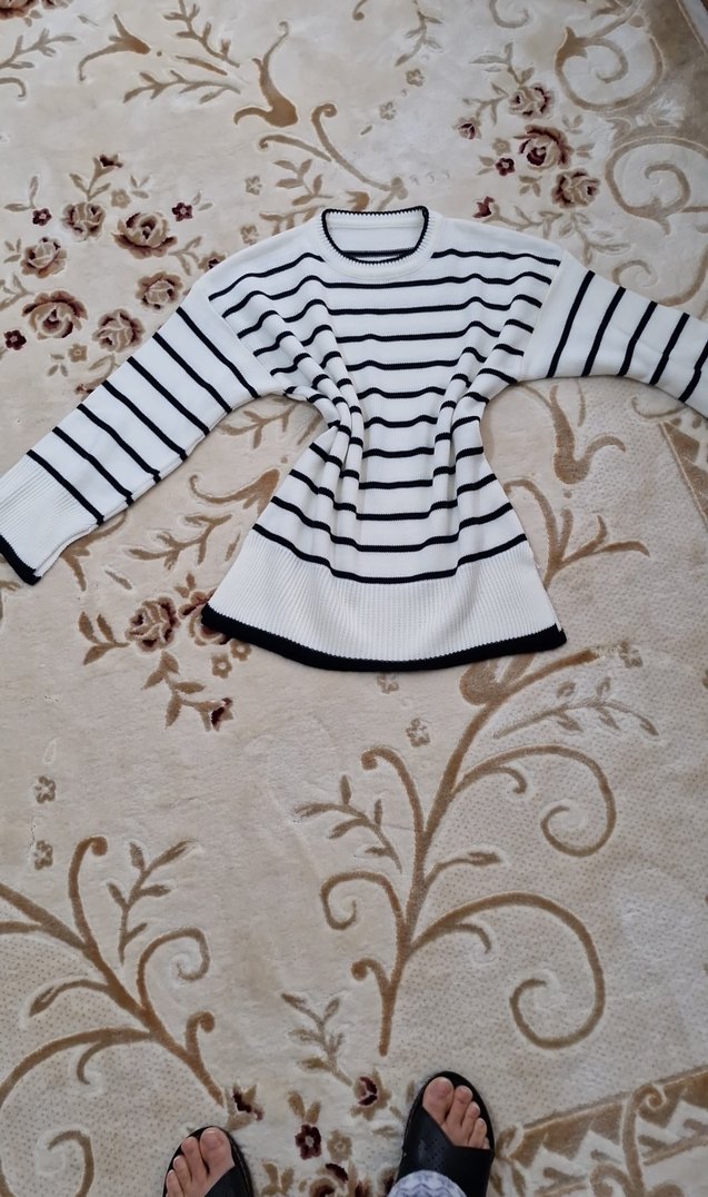 Uzun kollu, beyaz zemin üzerine siyah çizgili, geniş kesim triko kazak. Salaş ve rahat sokak stili için uygundur.