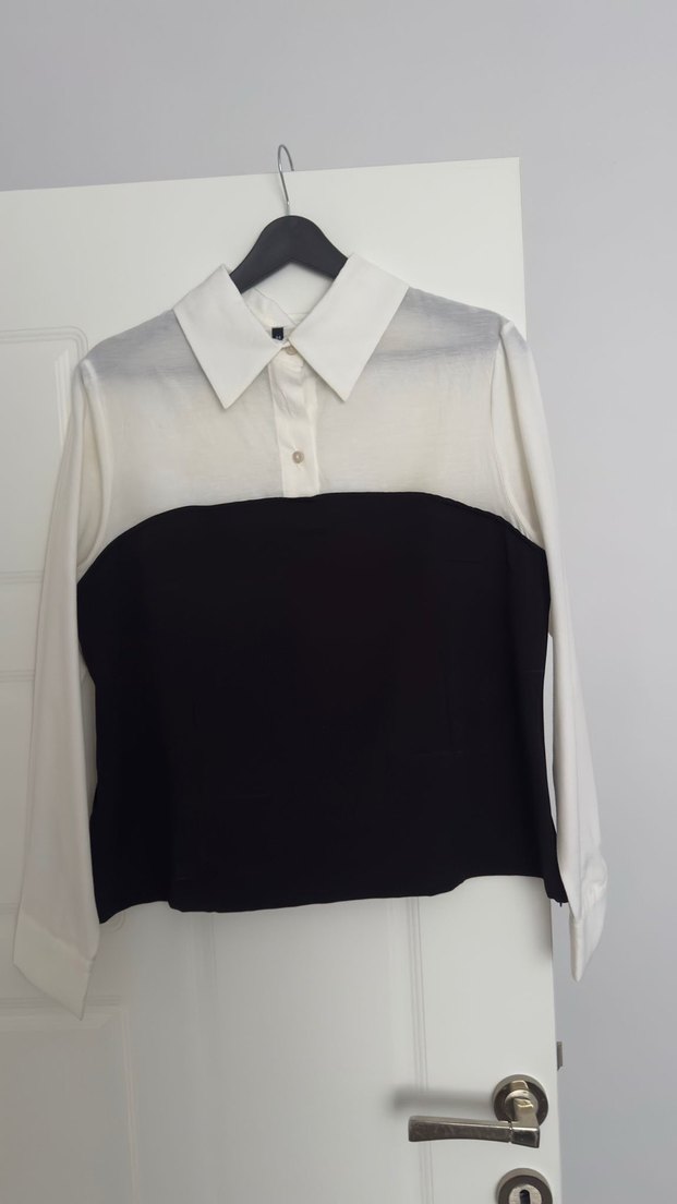 Uzun kollu, yakalı ve düğmeli kadın gömlek. Beyaz ve siyah renklerde, midi boyda, düz desenli ve ofis kullanımı için uygun. , rahat kesim.