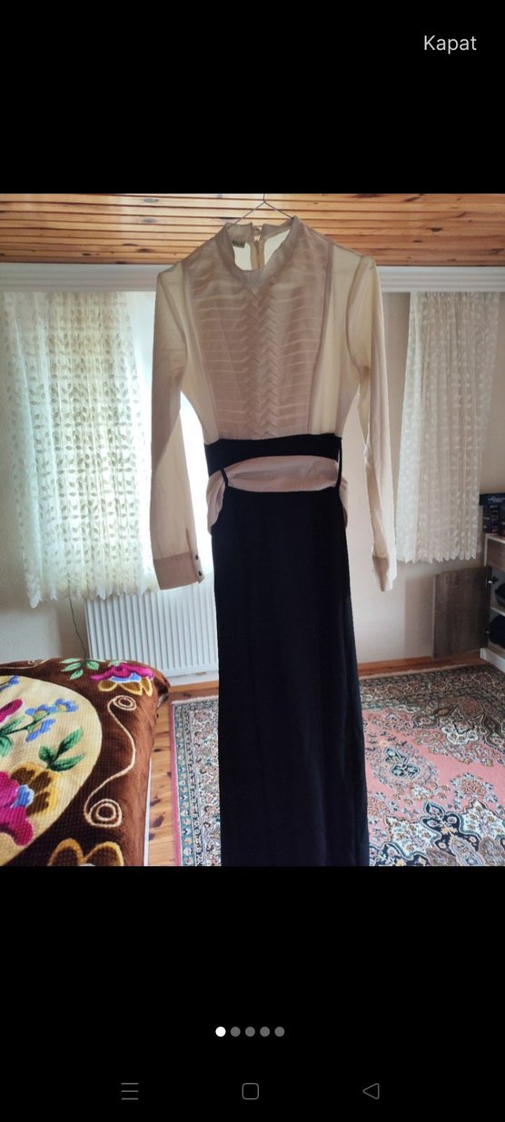Yüksek yakalı ve uzun kollu, drapeli üst kısmı beyaz, alt kısmı koyu renk olan uzun elbise. Ofis için uygun, klasik ve zarif duruş sunar.marka temsilidir