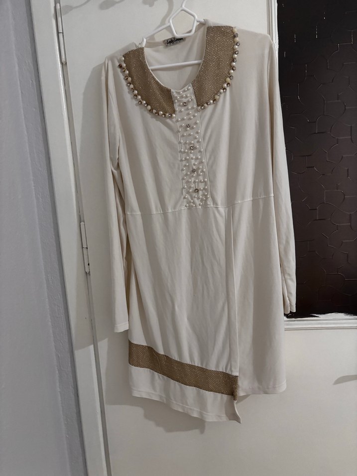 Uzun Kollu Beyaz taşlı ve simli Tunik