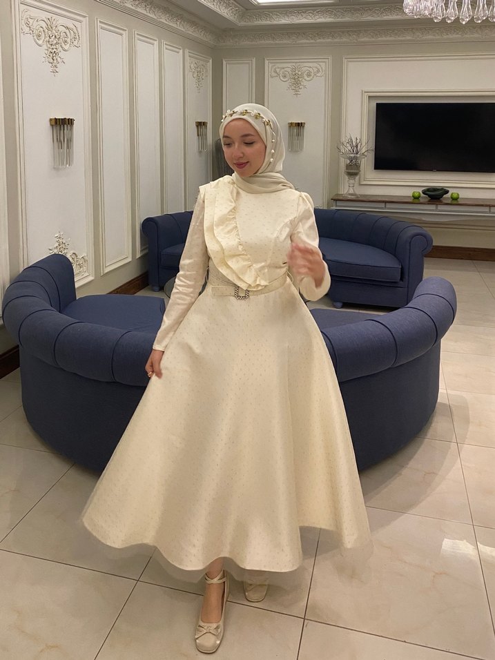 Uzun Kollu Beyaz Tesettür Abiye