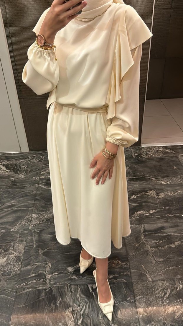 Beyaz uzun elbise, bol kesim ve drapeli detaylara sahip. Kayık yaka ve uzun kolludur. İpek gibi kumaştan, tesettür ve minimalist tarzda, düğün için uygun.