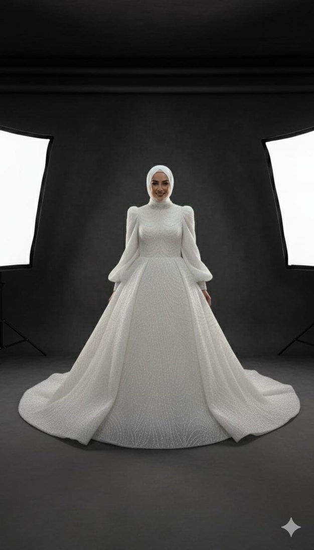 Yüksek yakalı, uzun kollu ve drapeli beyaz tesettür gelinlik. Modern klasik tarzda, uzun ve gösterişli kesime sahip, vücuda oturan model. İlgilenirseniz eğer yorum yazın, ayrıntılı fotoğraf ekleyebiliriz