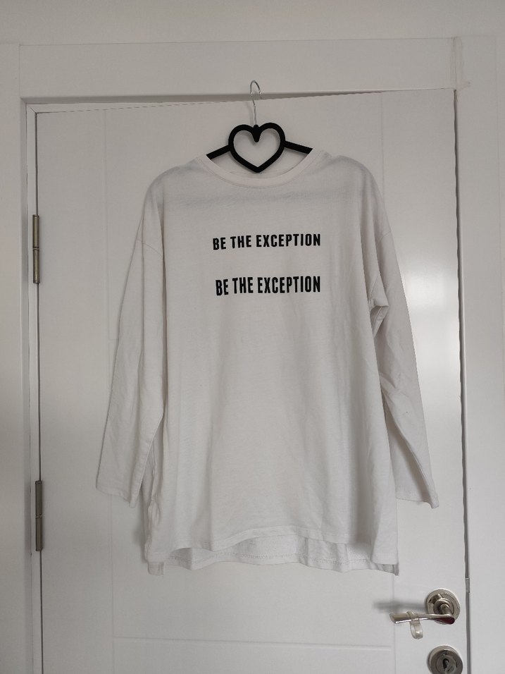 Pamuklu, uzun kollu ve yuvarlak yakalı beyaz hamile tişörtü. Önünde 'BE THE EXCEPTION' yazılı baskı bulunur, günlük kullanıma uygundur.