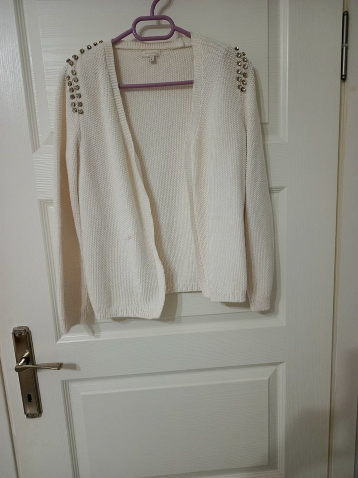 Uzun kollu, beyaz triko hırka. Notlu yaka ve gevşek kesimle rahat bir kullanım sunar. Omuzlarda metal aksesuarlar bulunur.