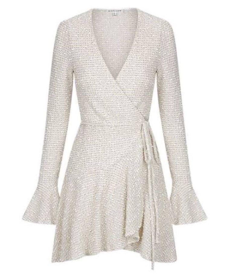 Uzun kollu, V yakalı beyaz triko mini elbise. Bohem tarzda, belden bağlamalı ve vücuda oturan kesime sahip, düğün için uygun Ürün mini ve sağlam hiç giyilmedi