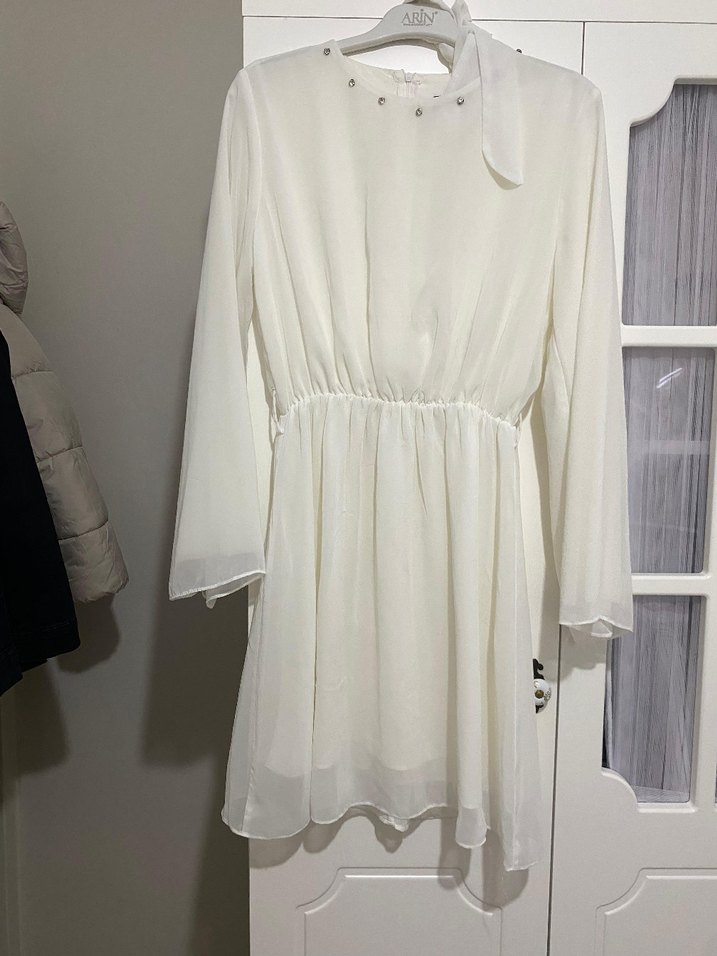 Uzun kollu, bol kesim beyaz tunik Düğünler için uygun sade ve zarif tasarım.