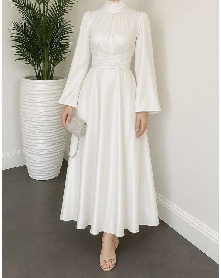 Yüksek yakalı, uzun kollu, beyaz uzun elbise. İpek gibi kumaştan, drapeli ve sade modern klasik tarzda, düğün için uygun, rahat kesim.