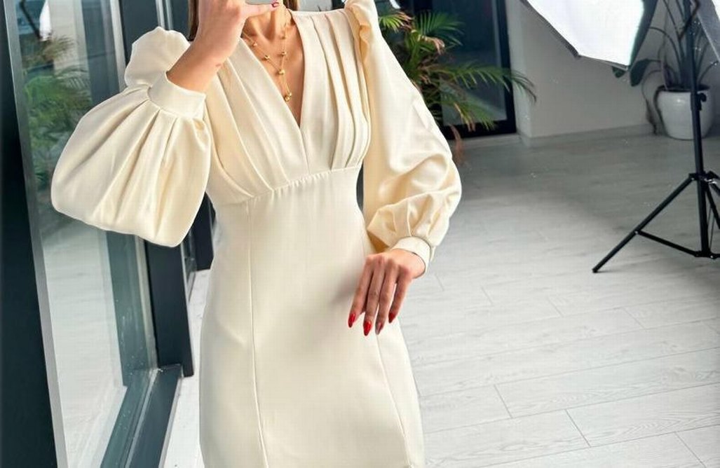 Uzun Kollu Beyaz V Yaka Drapeli Kadın Elbise