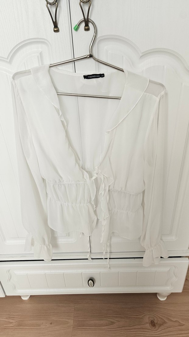 Uzun kollu, V yaka ve fırfır detaylı beyaz gömlek, normal boy ve dar kesimdir, rahat ve şık bir görünüm sunar.