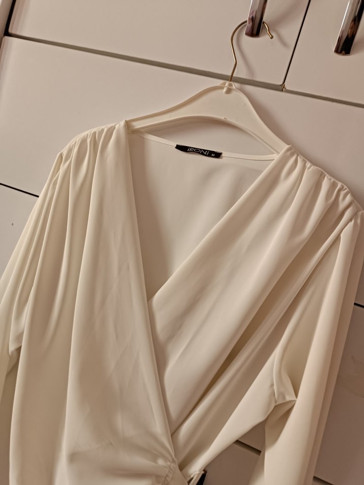 Beyaz, ipeksi kumaştan uzun kollu ve V yakalı, dökümlü, uzun ve bol kesim kadın bluz. Minimalist, desen içermeyen günlük kullanıma uygun tarz.