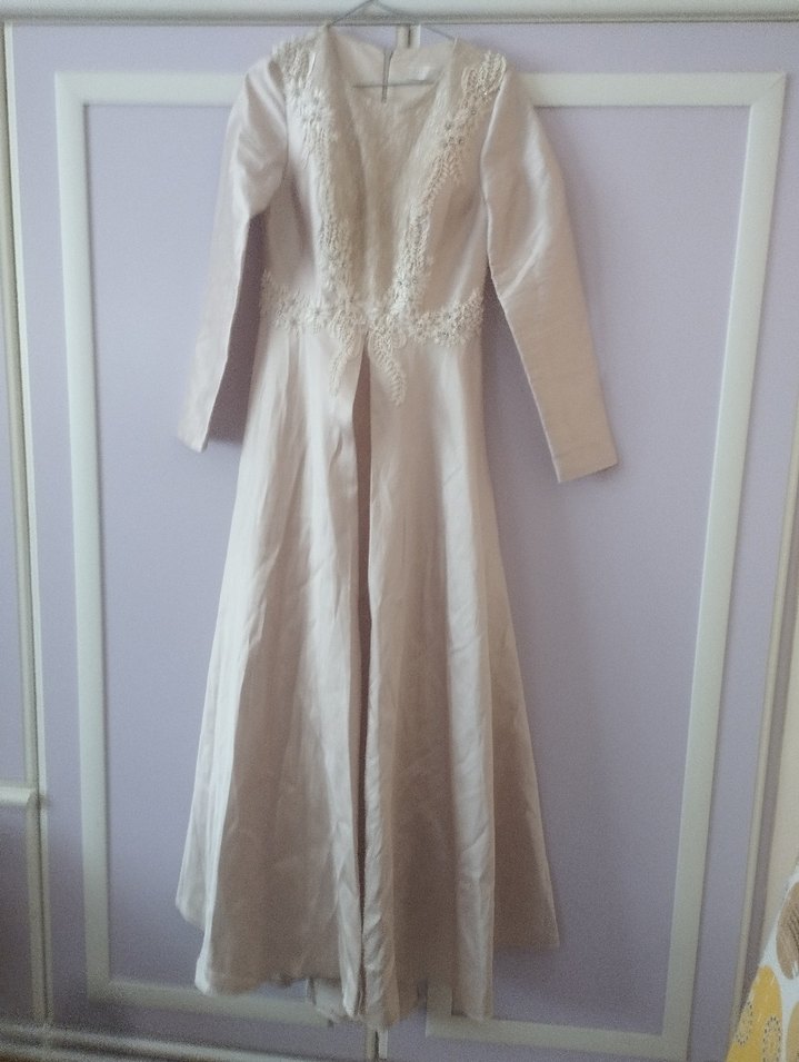 Uzun kollu, V yakalı vizon renk vintage abiye gövde kısmında zarif dantel detaylarıyla klasik ve şık bir görünüme sahiptir.