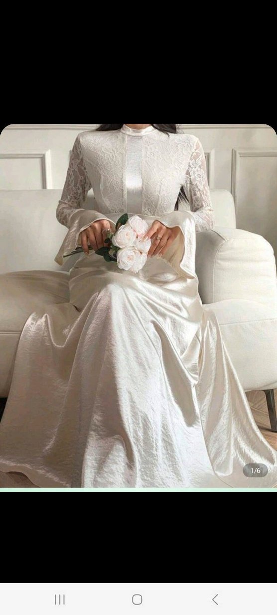 Uzun kollu ve yüksek yakalı, dantel detaylı beyaz gelinliktir. Modern klasik ve vintage şıklığı bir arada sunar. A kesim ve düzenli kalıptadır.