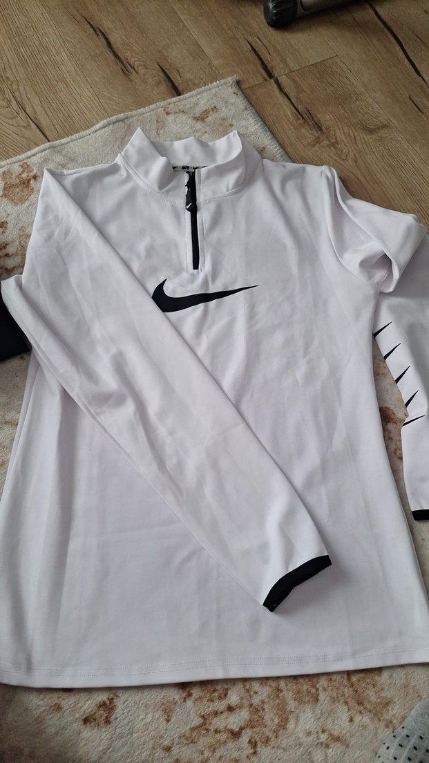 Uzun kollu, yarım fermuarlı yüksek yakalı kadın sweatshirt. İnce ve düz beyaz sentetik kumaştan, siyah logo ve detaylarla günlük sokak stiline uygun.