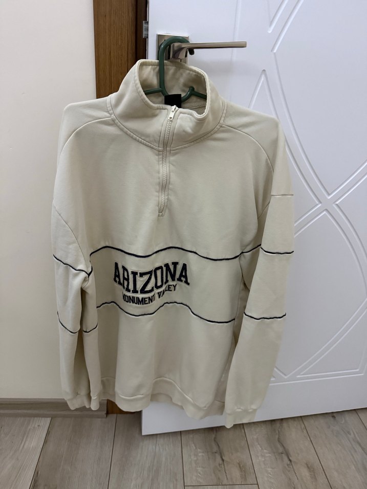 Yarım fermuarlı, yüksek yakalı beyaz sweatshirt, rahat kesimi ve baskılı detaylarıyla günlük kullanım için uygundur.