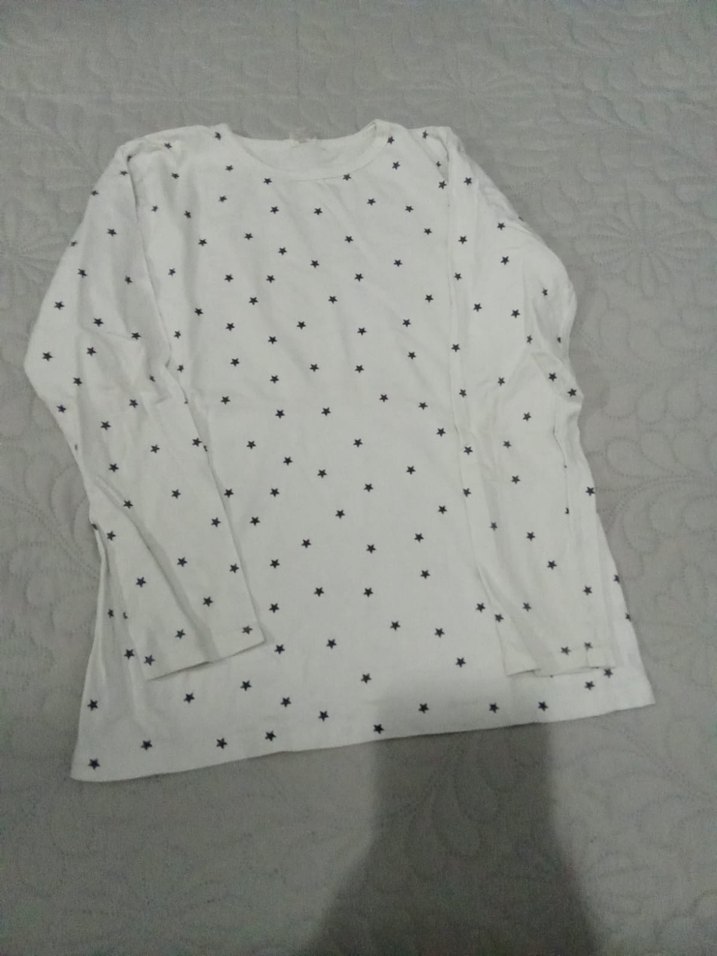 Pamuklu kumaştan, uzun kollu, yuvarlak yakalı, bol kesim kız tişörtü. Beyaz zemin üzerine siyah yıldız baskılı ve düğme detaylıdır. ⭐