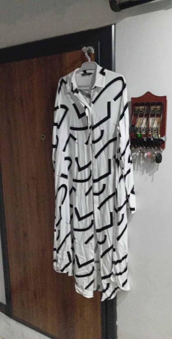 Uzun kesim, drapeli, bol kesim ve yakalı beyaz tunik, siyah zebra desenleriyle sokak modasına uygun bir parça. Uzun kolludur ve sentetik kumaştandır.