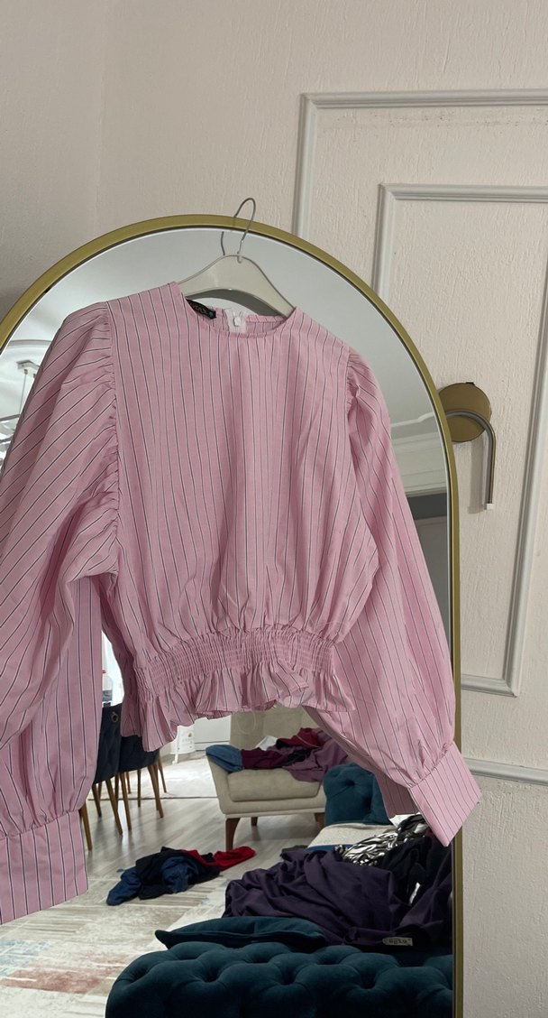 Pembe uzun kollu kız bluzu, piliseli detaylı, salaş kesim ve yuvarlak yaka. Yumuşak sentetik kumaştan, pastel çizgili desenli. Trendy günlük stil için uygun.