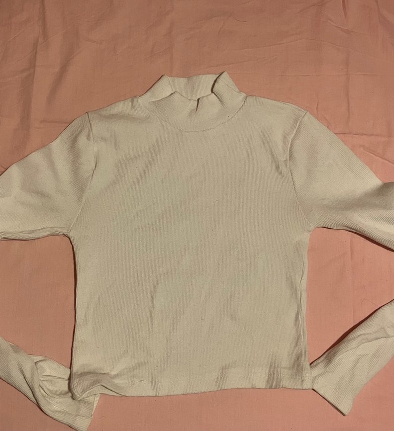 Bej renkli, yüksek yakalı ve uzun kollu kadın ince triko. Yumuşak keten kumaştan, normal boyda ve sade, minimalist tarzda günlük kullanım için uygun.