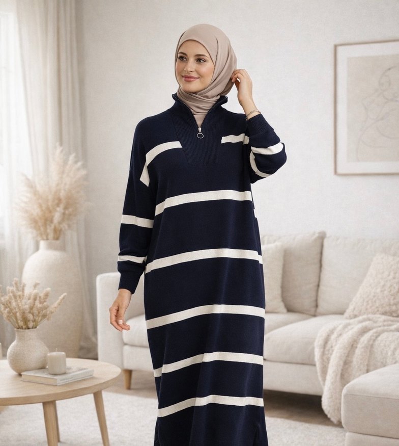 Koyu mavi renkli, uzun kollu, boğazlı ve bol kesimli kadın kazağı. Çizgili desenli , sentetik kumaştan rahat bir sokak stili ürünü.