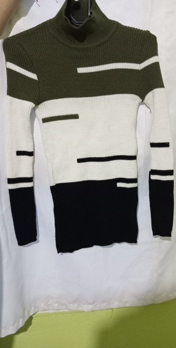 Bu kadın kazağı, uzun kollu ve boğazlı olup yumuşak triko kumaştan yapılmıştır. Kısa boyu ve gri, beyaz, siyah renk bloklu tasarımıyla günlük rahat kullanıma uygundur.