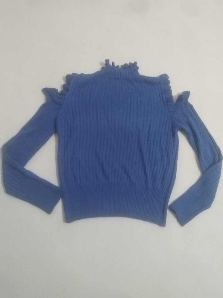Uzun kollu, boğazlı ve triko dokulu kadın kazak. Rahat ve desen içermeyen tasarımıyla günlük sokak stiline uygundur. Canlı mavi renkte.