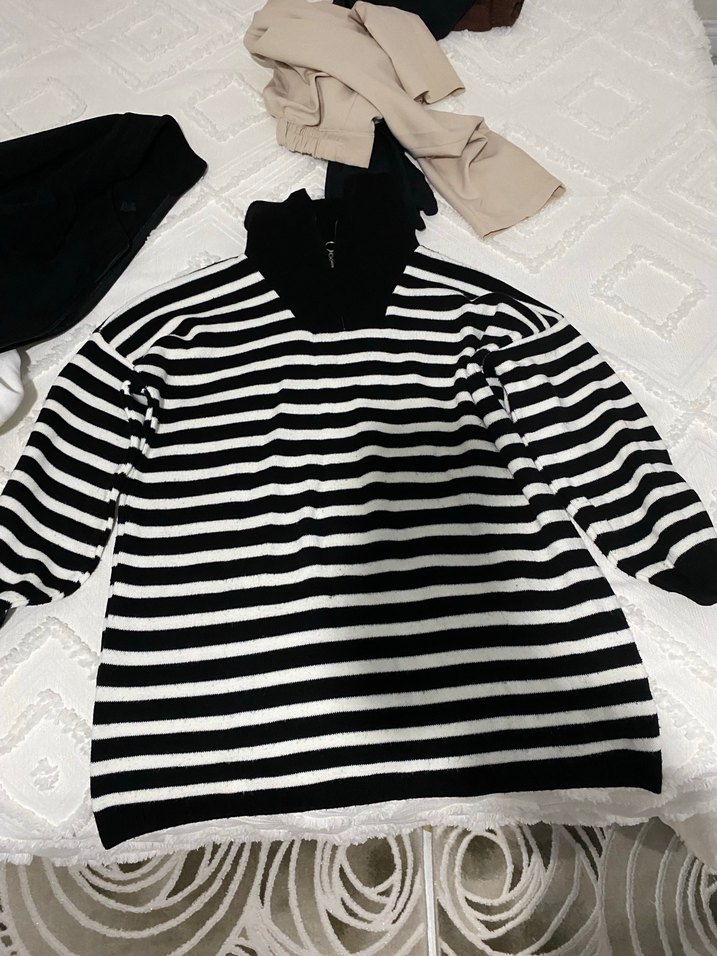 Uzun kollu, boğazlı ve zebra desenli triko kazak. Rahat kesim ve normal boyda, yumuşak ve sıcak kumaştan üretilmiştir. Günlük kullanım için uygundur.