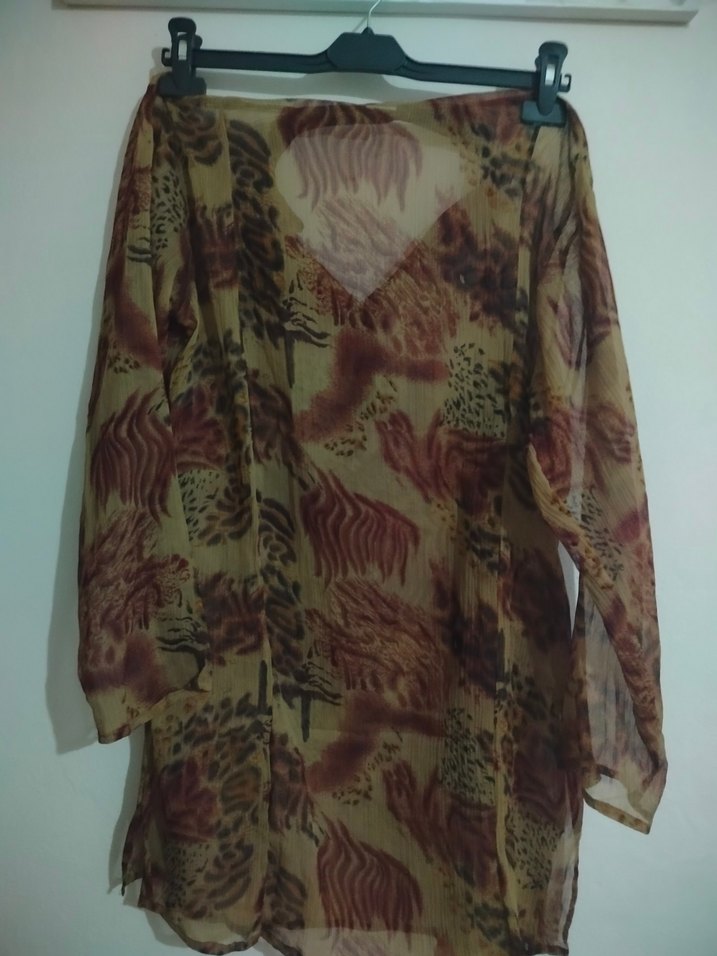 Hafif sentetik kumaştan yapılmış, uzun kollu ve tekne yakalı bol kesim bir bluz. Kahverengi bağlama desenli ve dökümlü tarzda, günlük kullanıma uygun.